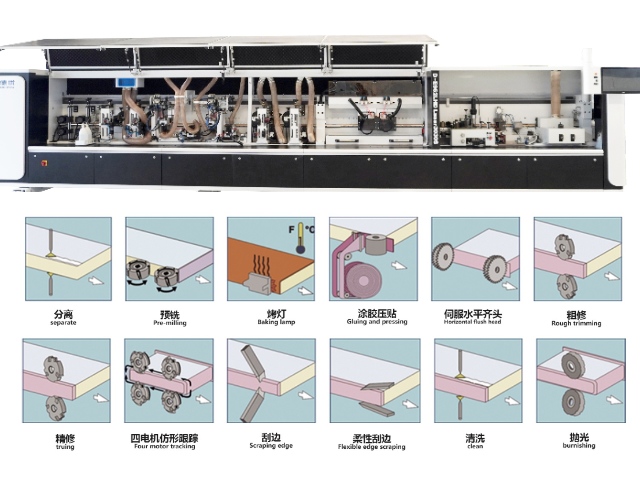 Нанесение разделительного агента → Кромкооблицовочный станок выполняет высокоскоростную фрезеровку стороны обрабатываемой доски, удаляя пыль → Конвейер транспортирует доску на станцию предварительного нагрева, где она равномерно нагревается до нужной температуры → Мощный лазерный генератор излучает луч света, который с помощью линзового блока точно фокусируется на функциональном слое на обратной стороне кромкооблицовочной ленты → Практически одновременно система высокоточных прижимных роликов с огромным давлением прижимает кромкооблицовочную ленту к краю доски. Расплавленный функциональный слой полностью проникает в древесные волокна и интегрируется с ними под давлением → Расплавленный функциональный слой быстро затвердевает при естественном охлаждении и охлаждении с помощью воздуха, образуя прочное «клепочное» механическое соединение с доской. Компонент проходит ряд этапов финишной обработки, включая обрезку, черновую обрезку, чистовую обрезку, зачистку кромок и полировку, удаление излишков материала и уточнение верхней, нижней и торцевых поверхностей кромочной ленты для обеспечения ее бесшовного соединения с поверхностью платы. → Наконец, обычно предусмотрено устройство для очистки от остатков обработки.