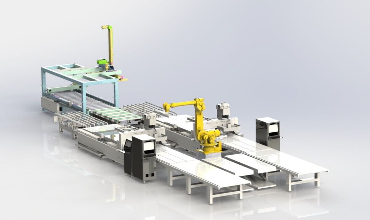 Общий процесс производственной линии выглядит следующим образом: Загрузка портала --- Маркировочная машина --- Маркировка --- Автоматическое распределение по левому и правому столам ожидания с помощью интеллектуальной системы распределения шкафного типа --- Загрузка машины --- Сборка машины --- Резка --- Обработка и перемещение на разгрузочную платформу --- Паллетирование с помощью роботизированной руки
