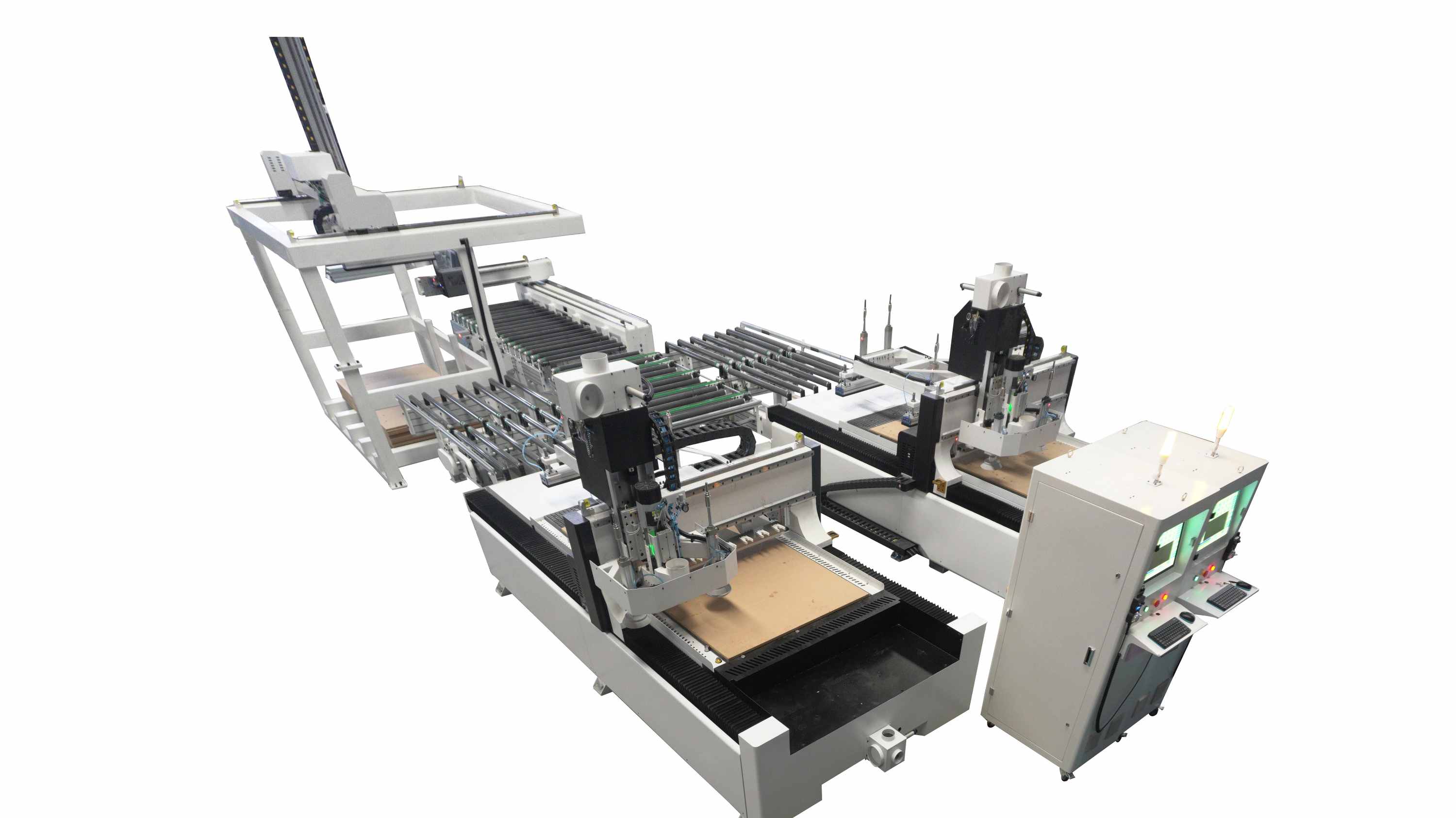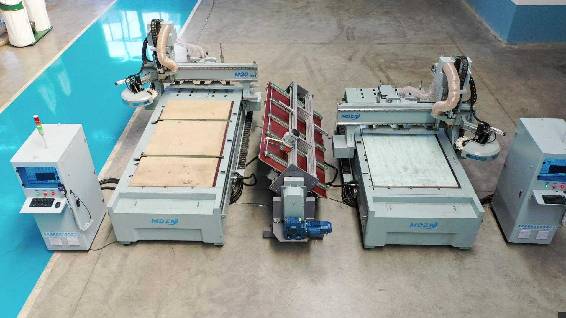 Обрабатывающий центр «один к двум»: одна портальная система загрузки обслуживает одновременно два гравировальных станка с ЧПУ. Пока один станок обрабатывает материал, портальная система уже загружает другой, что значительно сокращает время ожидания станка.